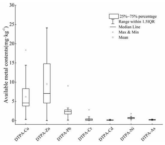 In addition to the total HMs, speciation of HMs is also key for evaluating the degree of pollution, because the accumulation of HMs in vegetables is usually positively correlated with the availability of metals in soil [31]. The DTPA-extractable metal content in soil is shown in Figure 3. The average DTPA-Pb, Cd, Cu, As, Zn, Ni, and Cr content in soil was 2.46, 0.12, 6.20, 0.19, 9.50, 0.71, and 0.38 mg·kg−1, respectively.