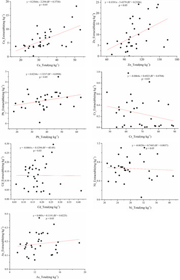 The available metal content (mg·kg−1) versus the total metal content (mg·kg−1) in soils.