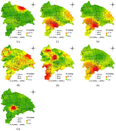 The prediction results of HMs (Figure 6) shows that the spatial distribution of Cd was relatively high in the southwest, and the high values in this region indicate point source pollution. According to the results of a Google Earth query, there are 10 HM pollution enterprises in this region. The primary types of enterprises were electroplating, electronics, and chemicals, while industrial activities were very high (e.g., alloy processing). Excessive industrial activity is one of the main causes of Cd accumulation [40]. High values of Pb were due to main roads with high traffic; automobile exhaust contains a large amount of Pb, which is commonly considered as an indicator of vehicular transport [41,42].