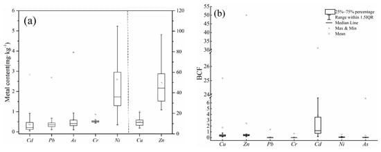 Bioconcentration factor (BCF) is an important method for studying the migration and transformation of HMs from soil to crops. The BCF can reflect the ability of crops to absorb and become enriched with metals from soil [34]. The BCF values were determined as follows: