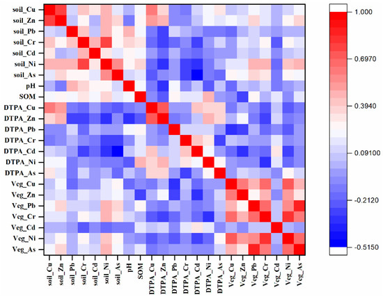 Pearson correlation matrix of HMs in soils (mg kg−1), soil DTPA-extractable metal content (mg kg−1), and metal accumulation in vegetable samples (mg kg−1).
