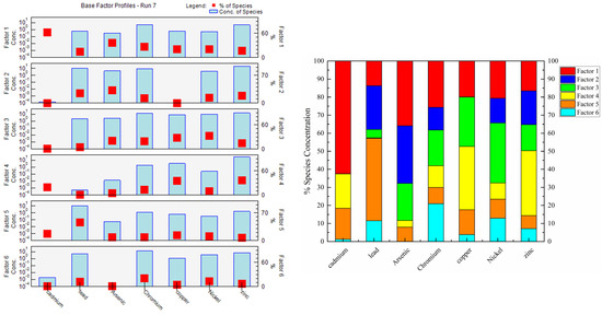 Six sources of HMs were identified by source apportionment using PMF shown in Figure 9, which was dependent on minimization and stable Q value to determine the most suitable number of factors. Residuals of most soil samples ranged from −3.0 to 3.0, and R2 > 0.94 indicating a strong correlation between HMs. The PMF results are shown in Figure 9.
