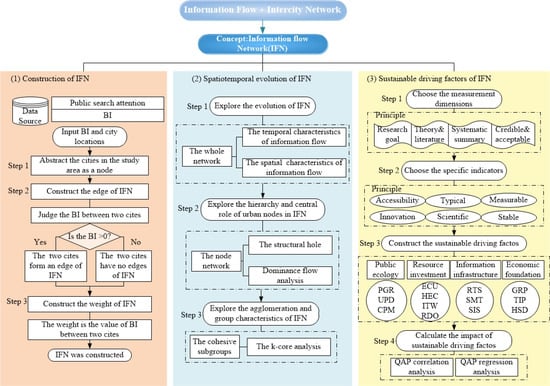 We constructed a feasible research framework to explain the evolution of intercity network based on information flow and the impacts of urban sustainable driving factors from the perspective of public search attention. Particularly, the concept of information flow network (IFN) was proposed in this research; meanwhile, BI, an index that quantifies public search attention reflecting information flow, was loaded into the IFN as data support. Furthermore, we measured the spatiotemporal evolution and urban role of the IFN from three aspects: the whole network, the nodes hierarchy, and the aggregation of subgroups. Finally, to explore the impact of driving factors for urban sustainable development, a correlation analysis and regression analysis were carried out between the sustainable driving factors and the IFN. The research framework proposed in this paper is shown in Figure 1.