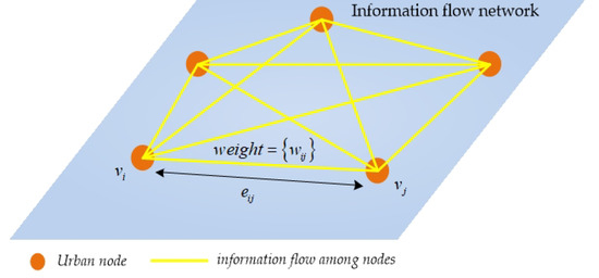 where rij is the information flow of city i to city j; rji is the information flow of city j to i. Then, the whole information flow of node i was calculated by the sum of the edge weight of eij. The whole information flow of node i is presented by Equation (4):