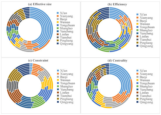The structural holes theory is one of the common theories used in network structure analysis [49,50]. The theory of structural holes suggests that if there are no direct connections between node A and node B, then there is a structural hole between A and B. Meanwhile, if a node C, which connects node A and B, serves as an intermediary, then node C has occupied the structural hole with more resources and connections. Therefore, an urban node with more structural holes indicates that it has gained more resources and connections and is in a dominant position. According to the research results of previous scholars, the typical measurement indicators of structural holes are “indicators of Burt” and “centrality indicators”. Burt proposed that the calculation of structural holes needed to consider four relevant indicators: effective size, efficiency, constraint, and hierarchy [51]. Centrality, as an important indicator to measure the core degree of nodes in the network structure, reflects the core position of the node in the structural holes [52]. Table 2 shows the specific meaning of typical structural holes indicators.