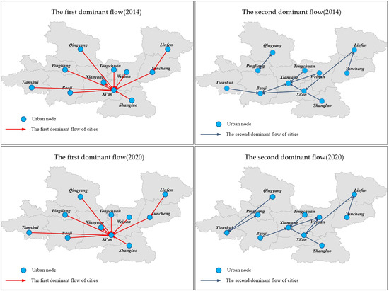Dominance flow analysis is a relatively mature graph method for exploring the hierarchical structure of urban nodes, which has been widely used in the urban hierarchical structure. Dominance flow analysis supports that there are many “flows” in the network, with different scales and directions. Furthermore, Nystuen and Dacey proposed that each urban node will generate the largest-scale flow with other urban nodes, which is defined as the “dominant flow” in the network [53]. Dominance flow analysis extracts the main node hierarchy of the network by calculating the dominance flow of each node in the network. In this study, there are many kinds of “information flow” in IFN, and information flow generates from one city to another city. In the dominance flow analysis, we did not ignore the direction and scale of information flow. We defined the largest-scale information flow in the IFN as the “first dominant flow” and the second-scale information flow as the “second dominant flow”. For example, the information flow from node A to node B is the largest-scale comparing to the other nodes, which indicates that node B receives a “first dominant flow”. Furthermore, each urban node is divided into dominant nodes, subdominant nodes, and subordinate nodes according to the number of dominant flows received. The specific calculated process and affiliation of urban nodes are shown in Table 3 and Table 4 respectively.