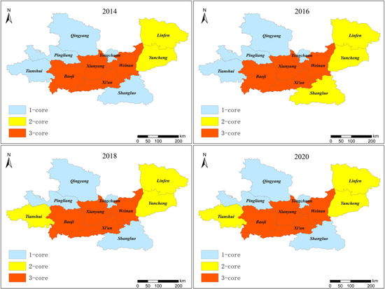 In the information age, the evolution of the intercity network is still limited by geographic distance. The research results of cohesive subgroups show that the agglomeration among neighboring cities is stronger, which makes it easier to form agglomerated subgroups with obvious regional spatial characteristics. For example, the urban nodes in the central region of GPUA, such as Xi’an, Xianyang, Baoji, and Weinan, with closer geographical distance and superior location, quickly formed a cohesive subgroup. This feature can be explained in the research of Wu et al. [40]: longer geographic distance will weaken the spread of information flow, while the information flow between neighboring cities has a strong agglomeration. The reason is that due to population migration, convenient transportation, and closer policy cooperation among neighboring cities, the information flow exchanges frequently. In the frequent policy cooperation environment, urban residents will show a higher degree of attention, which will generate more information flow.