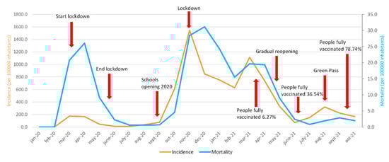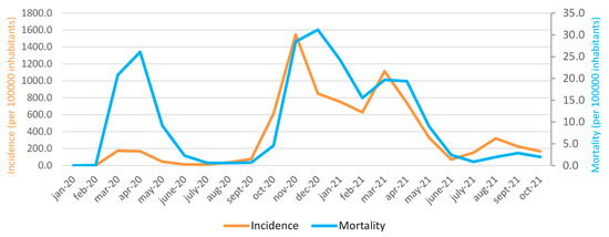 Figure 1 shows the monthly trend of the cumulative incidence per 100,000 inhabitants in the period January 2020–October 2021. It is important to underline 3 peaks of incidence and mortality rates that occurred during the three waves of COVID-19 of March–April–May 2020, October–November–December 2020, and March–April–May 2021. There is a slight increase in incidence in August 2021 (320.6) and in mortality in September 2021 (2.9), while, in October, there is a slow and progressive decrease in both incidence and mortality. In addition, it is possible to observe that, at the onset of the COVID-19 pandemic, in Italy (March 2020), there was a higher mortality peak than a significantly lower incidence. The highest incidence peak was reached in November 2020 (1546.1), while the highest mortality peak was in December 2020 (31.2). On the other hand, the lowest values of incidence and mortality are observed in February 2020 (values of 1.9 and 0, respectively).