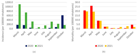 (a) Comparison of the cumulative incidence in the Italian population (per 100,000 inhabitants, range scale 0.0–1200.0) in 2020 and 2021 for the period March–October. (b) Comparison of mortality rate in the Italian population (per 100,000 inhabitants, scale range 0.0–30.00) in 2020 and 2021 for the period March–October.