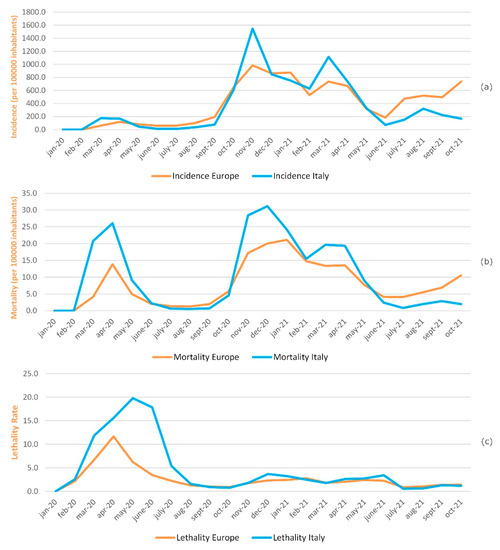 Comparison between Europe and Italy: (a) Incidence, (b) mortality, (c) lethality. For European countries, the resident population reported by the Our World in Data was used. For Italy, the ISTAT population was used as of 1 January 2020 and 1 January 2021.