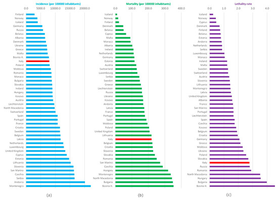 Comparison among European countries: (a) Incidence, (b) mortality, (c) lethality. For European countries, the resident population reported by the Our World in Data was used.