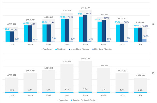 Figure 6a shows the percentages of first, second, and third doses of vaccine administered in the Italian population, stratified by age group and reference population. The age groups 80+ and 70–79 have achieved the highest vaccination coverage (93.6% and 91.1% of second doses, respectively). The lowest percentage of second vaccine doses administered (67.2%) was present in the 12–19 age group.