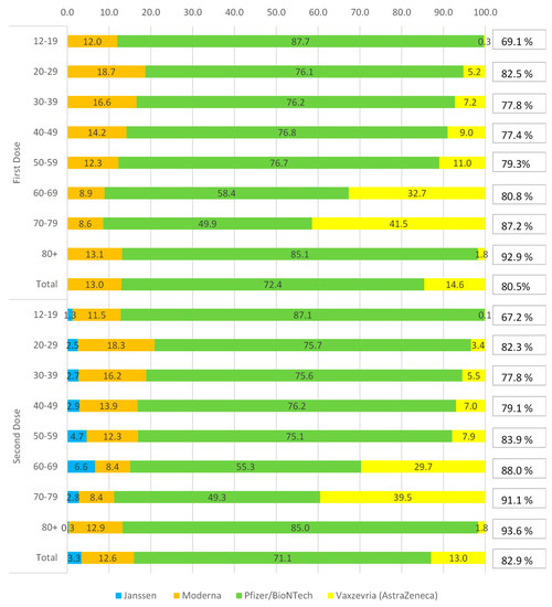 The Vaxzevria (Astrazeneca) vaccine was used in 14.6% and 13.0%, for the first and second dose. This type of vaccine was preferred for the intermediate and over 60 age groups, particularly for the 70–79 age group (41.5% and 39.5%, first and second dose).