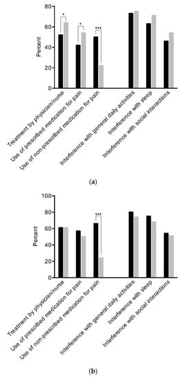 (a) Pain-related behavior and pain interference in participants with (black bars) and without (grey bars) daily substance use. Legend: p-value from chi2-test. * p < 0.05, *** p < 0.001. (b) Pain-related behavior and pain interference in participants with (black bars) and without (grey bars) injection substance use. Legend: p-value from chi2-test. *** p < 0.001.