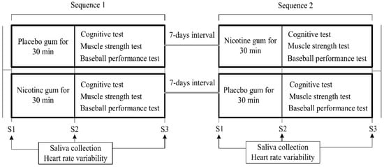 The experimental protocol (Figure 1) was a crossover design that was implemented during 7 days. On arrival at the laboratory, each of the participants was fitted with an HR monitor (Polar V800, Kempele, Finland) and seated for 5 min, after which a baseline HR measurement was taken separately at stages 1–3. Initially, the participants were requested to remain in a seated position, and saliva samples were collected (Stage 1, S1). For the experimental trials, the participants chewed 2 mg nicotine gum (Nicotine group) or flavor-matched placebo gum (Placebo group) for 30 min while seated, and the participants’ saliva was then collected again (Stage 2, S2). Low-dose nicotine (2 mg) was proved to raise the levels of physiological and central nervous system activity [19]. Therefore, 2 mg nicotine gum was used in the current study. They then completed the Cognitrone (COG) test and the grooved pegboard test (GPT) from the Vienna Test System (VTS) as well as a muscle strength test. Furthermore, their baseball-hitting performances with respect to concentration and speed were measured. When the participants had completed all the tests, their saliva samples were collected (Stage 3, S3). All experimental trials were conducted at the same time of day; the participants were instructed to abstain from alcohol or any exercise and to only pursue habitual caffeine use (because abstinence would in itself confound withdrawal effects) on the day of and prior to any experimental trial. Additionally, to ensure similar metabolic states, the participants were asked to replicate the diet they consumed immediately prior to the first experimental visit in the lead-up to subsequent trials.