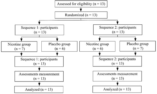 Thirteen participants were recruited in this study, and they were randomly assigned to one of two groups throughout the study. All participants completed the study without reporting negative side effects (Figure 2). The participants’ demographics are summarized in Table 1. The mean salivary cotinine concentration at 30 min after nicotine supplement was 11.2 ± 1.5 ng/mL and was undetectable at S1 and S3.
