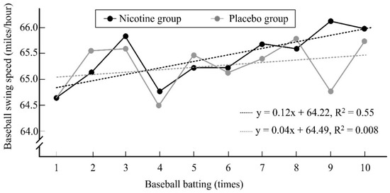 The hit percentage among the participants in the nicotine group was significantly higher than that among those in the placebo group (33.00% ± 23.71% vs. 24.50% ± 17.71%, d = 0.41, 95% CI = −0.37 to 1.18, p = 0.04). Furthermore, the changes in the slopes of baseball bat swing speed in the nicotine group (R2 = 0.55) and placebo groups (R2 = 0.008) increased over the 10 hit attempts, indicating a higher bat swing speed with increasing hitting time in both groups (Figure 3). However, compared with that in the placebo group, the slope in the nicotine group had a higher decreasing trend, indicating a higher increase in bat swing speed with increasing hitting time.