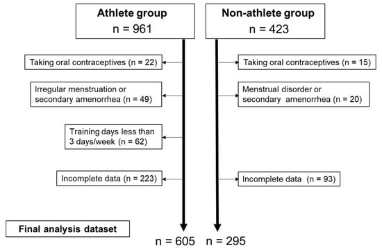 Our cohort of participants included 961 athletes and 423 non-athletes who were recruited with the help of faculty members from six Japanese universities located in Tokyo (three universities), Ibaraki (two universities), Chiba (one university), and Okayama (one university). The athlete group consisted of university students who majored in physical education or sports science and/or who belonged to athletic clubs. The non-athlete group consisted of university students who majored in subjects other than sports science, such as nutrition and nursing, and/or those who did not participate in athletic competitions, such as managers of athletic clubs. This study included women who were aged 18 to 30 years, those who had never been pregnant and/or given birth, those who did not take oral contraceptives, and those who did not have irregular menstruation or secondary amenorrhea. University athletes were defined as those who belonged to an athletic club (not a recreational club), participated in competitions on a regular basis, and trained at least 3 days per week. As shown in Figure 1, 356 women in the athlete group and 126 women in the non-athlete group were excluded owing to the following exclusion criteria: those taking oral contraceptives (n = 22 and n = 15 in the athlete and non-athlete groups, respectively), those with irregular menstruation or secondary amenorrhea (n = 49 and n = 20, respectively), those who trained less than 3 days a week (n = 62 in the athlete group), and those with incomplete data (n = 223 and n = 93, respectively). The final analysis dataset comprised data from 605 athletes and 295 non-athletes. The athletes played basketball (n = 98), track and field (n = 88), lacrosse (n = 62), handball (n = 62), volleyball (n = 44), soccer (n = 33), rhythmic gymnastics (n = 32), dance (n = 32), softball (n = 27), kendo (n = 23), judo (n = 23), swimming (n = 19), badminton (n = 14), baseball (n = 13), tennis (n = 12), cheerleading (n = 9), gymnastics (n = 6), wheel gymnastics (n = 5), and wrestling (n = 3).