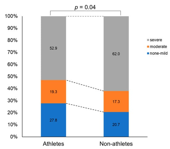 As shown in Figure 2, the severity of dysmenorrhea differed significantly between athletes and non-athletes (p = 0.04, ES = 0.09). Dysmenorrhea was shown to be more severe in non-athletes (none/mild 21.2%, moderate 17.2%, and severe 61.6%) than in athletes (none/mild 27.8%, moderate 19.3%, and severe 52.9%).