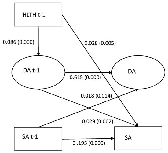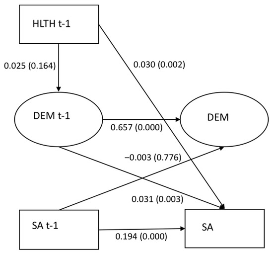 Employment in the health and social care industry, compared with other industries on the Swedish labour market, was associated with more register-based sickness absence of 15 days or more two years later (0.032, p = 0.002). As shown in the path from health and social care industry t-1 and health and social care industry t (0.918, p = 0.000, see Table 2), few participants changed employment industry over these years. There was no indication of a selection of individuals with more sickness absence in the health and social care industry (0.005, p = 0.225). The fit statistics of the model were RMSEA 0.000, CFI 1.000, TLI 1.000, and SRMR 0.000.