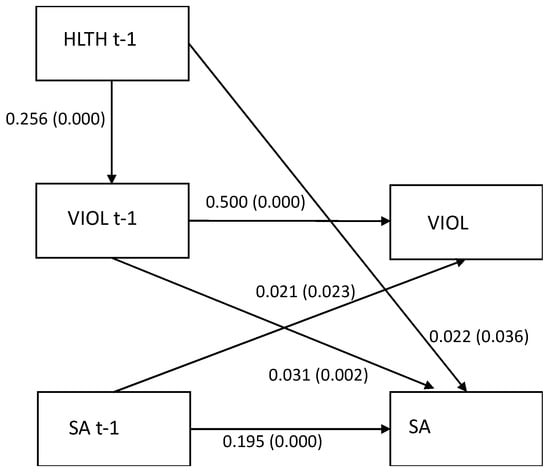 In a second step, following the same temporal structure as above, we examined the bivariate multilevel structural cross-lagged relationships between employment in the health and social care industry (predictor variable) and high job demands, low decision authority, and work violence (putative mediators) as well as between high job demands, low decision authority, and workplace violence and sickness absence (outcome). The models were adjusted for the same set of covariates as above. If there are significant paths between the predictor and the mediator and between the mediator and the outcome, a multilevel SEM mediation model can be fitted.