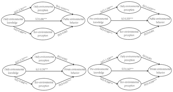 The whole model was highly acceptable (chi square = 3170.97, CFI = 0.924, TLI = 0.879, RMSEA = 0.057, 90% C.I. = (0.056, 0.058)). To display the outcome clearly, the model was divided into four groups, respectively(shown as Figure 1). Firstly, we focused on the correlation between daily environmental knowledge and public environmental behavior, the direct coefficient of these two factors was positive and significant (β = 0.496, p < 0.001). The result also showed that the indirect relationship between these two factors via daily environmental perception and ecological environment perception was significant (indirect effect = 0.074, 95% CI (0.054, 0.095)) and significant (indirect effect = 0.002, 95% CI (−0.003, 0.006)), respectively. Our result indicated that the daily environmental knowledge of Chinese residents can effectively stimulate the generation of public PEB. For example, when Chinese residents have understood that automobile exhaust emissions are harmful to health (Daily environmental knowledge), they would call for public transport instead of driving (Public environmental behavior). Additionally, the daily environment perception partially mediates the above process. Such conclusion is consistent with the extent literature [17,18].