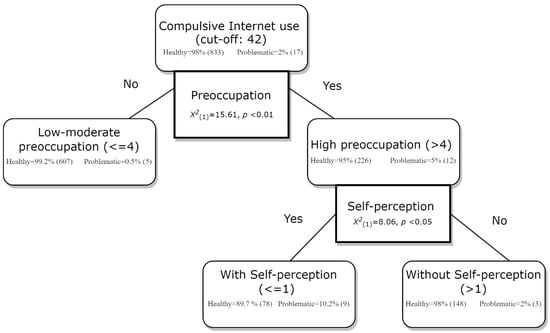 Discriminating factors for compulsive internet use in adults (subgroups of healthy and problematic users—with percentage and frequency).