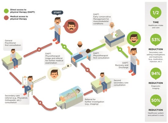 Direct access to physical therapy (DAPT) is the patient’s ability to self-refer to a physical therapist without previous consultation from any other professional (e.g., physicians or nurses) [1]. The World Physiotherapy organization strongly advocates this model of care, promoting a change in the mindset of government and the consumers about how DAPT can benefit healthcare systems and society [2]. Many healthcare systems (e.g., United States, United Kingdom, Australia) have implemented this model of care since it has demonstrated better clinical outcomes. Moreover, DAPT has reported a lower economic burden [3,4]—either for direct (e.g., number of visits, imaging) and indirect costs (e.g., lost workdays)—compared to traditional models of care (e.g., physician-centered paradigm) (for further details, refer to Table 1) [4,5,6,7]. The model of DAPT was mainly implemented to manage musculoskeletal disorders (MSDs) [8], a group of clinical conditions (e.g., low back pain, neck pain, shoulder pain) with a huge epidemiological burden and worldwide healthcare systems workload [9]. The Global Burden of Disease (GBD) study ranked MSDs—with low back pain and neck pain within the first five causes—within the top 20 leading causes of disability among the worldwide population [9]; focusing on the work-age population, MSDs become two of the ten leading causes for disability, with increased healthcare utilization and socioeconomic burden.