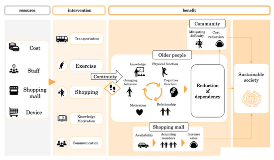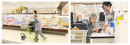 Shopping can be used as a nudge for rehabilitation, which could drive rehabilitation among older people. This is known as “shopping rehabilitation”, which allows older people to enjoy shopping and naturally engage in rehabilitation [10]. In this rehabilitation process, persons who find it difficult to leave their home and require support visit a commercial facility by being picked up from their homes and engaging in rehabilitation, as exercise is added to the shopping experience using a cart dedicated to rehabilitation. This effort to incorporate shopping into rehabilitation may act as a nudge to motivate older people [10].