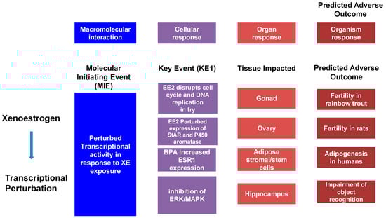 EDCs interfere with many hormone-regulated physiological pathways and have complex effects on human and fish physiology due to the diversity of the hormone receptors and enzymes that they bind []. The detailed mechanisms by which ED compounds act is not completely understood, but many interact with nuclear receptors, such as the retinoid X receptor (RXR) [,,,], peroxisome proliferator-activated receptors (PPARs) [,,,,] and estrogen receptors (ERs) [,]. The binding of EDCs to these and other receptors, as well as steroidogenic enzymes, can perturb normal physiological processes. Health effects attributed to EDCs include reproductive dysfunction (e.g., distorted male/female sex ratios in fish, elevated or reduced hormone levels, diminished fertility, and male and female reproductive tract abnormalities) [,]; premature puberty []; neurological [,] and behavioral [,,,] complications; immune dysregulation [,]; cancer [,,,,] and metabolic diseases [,,,,,,,,,,]. EDCs include personal care products, plasticizers, detergents, insecticides, and pharmaceuticals. Many of these chemicals enter rivers and the ocean, where they directly interact with aquatic life and disrupt endocrine responses. Humans are exposed to these EDCs from drinking water and dietary consumption of fish []. In this review, we explore the major classes of EDCs, their health and environmental impacts and the emergence and application of high-throughput (HT) genomics technologies and bioinformatics approaches in studying their adverse effects. We explore how this has resulted in risk assessment strategies leveraging these HT approaches and the development of toxicology databases. We examine how the Adverse Outcome Pathway (AOP) framework leverages these data sets to determine the adverse health and environmental impacts.