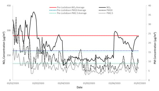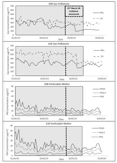 3.3. Effect of COVID-19 on Concentrations of NO2, PM2.5, and PM10 at Platform 10B, New Street