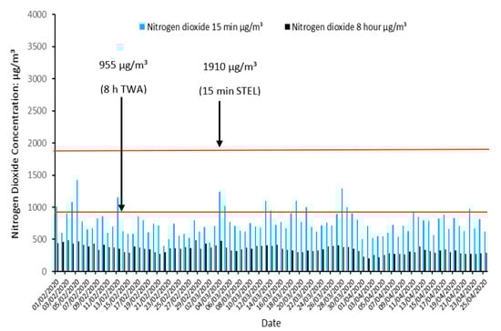 | NO2 | 955 µg/m3 | 1910 µg/m3 | 40 µg/m3 | 200 µg/m3 1 h mean |