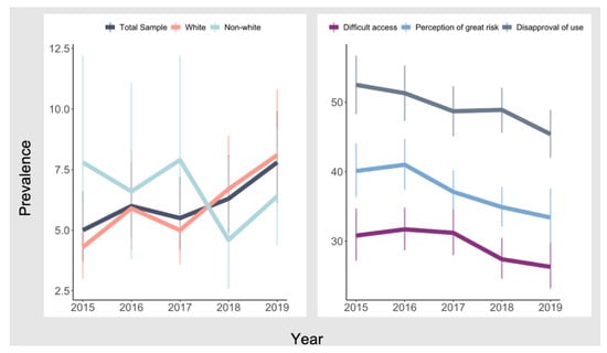 The present study takes an initial step to investigate the secular trends of substance use among U.S. individuals with CVD by using a nationally representative survey data from 2015 to 2019. We focus on tobacco, alcohol, and cannabis, as these are three of the most commonly used substances among general populations [,]. In addition, we investigated racial/ethnic patterns, which is consistent with prior studies reporting racial/ethnic variations, such as higher rates of alcohol and tobacco use among White adults compared to their Black counterparts [] and recent increases in cannabis use among non-White adults compared to White counterparts []. Lastly, given the evidence of increasing adult cannabis use and substantial changes in the legal and societal contexts of U.S. cannabis use [,,,,,], this study devotes special attention to cannabis-specific contexts. As a supplementary analysis, we examined how cannabis-specific contexts (i.e., accessibility to cannabis, risk perception of cannabis use, and disapproval of cannabis use) have evolved in recent years and are associated with the latest cannabis trends among adults with CVD. Knowledge gained in this study can inform behavioral health policy, educational efforts, and intervention development aimed at reducing the adverse effect of substance use on those with CVD.