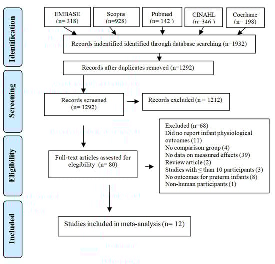 The search strategy yielded 1932 (out of which, 640 were marked as duplicates) studies. In total, 1292 records underwent abstract screening. Of those, 1212 did not meet inclusion criteria. Out of those, 80 full-text articles were assessed for eligibility, and among these 12 were included in the meta-analysis. The PRISMA flow diagram is presented in Figure 1.