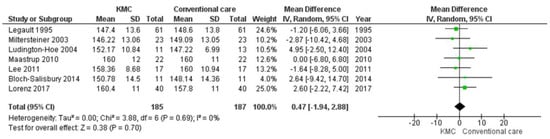 A total of eight independent studies were included in this analysis. Data from 372 infants were evaluated (185 in the intervention group and 187 in the control group). The mean heart rate of infants receiving conventional care was lower than that of infants receiving kangaroo mother care, although evidence of differences between groups did not reach statistical significance and there was no evidence of statistical heterogeneity in this outcome (MD 0.47 beats per minute (BPM), 95% CI −1.94 to 2.88); (heterogeneity: T² = 0.00, p = 0.69, I² 0%). For forest plots, see Figure 4.