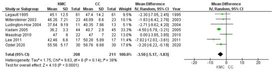 Data from 419 infants were evaluated (208 in the intervention group and 211 in the control group). Figure 5 shows the results of a meta-analysis model including all seven studies. Overall, significant differences in respiratory rate values were observed in favour of the kangaroo mother’s care compared to the control group (MD, −3.50; 95% CI, −5.17 to −1.83; p < 0.00001). However, moderate heterogeneity was observed in these seven studies (I2 = 38%).