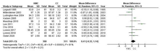 Data on infant oxygen saturation were obtained from 10 studies. Data from 619 infants were evaluated (308 in the intervention group and 311 in the control group). The mean oxygen saturation was lower in infants receiving conventional care than in infants receiving kangaroo mother care, with statistically non-significant data on differences between groups and high heterogeneity (MD 0.41% 95% CI −0.32–1.14) in this result (heterogeneity: T² = 1.01, p < 0.00001, I² 81%) (Figure 6). This effect was similar in all subgroups of study characteristics, gestational age of infants and duration of intervention (Supplemental Figure S1).