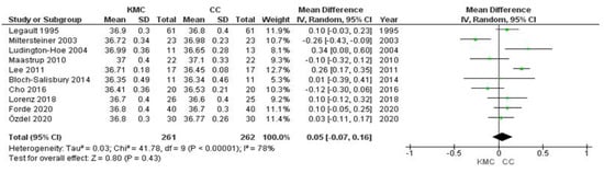 Forest plots for effects of KMC compared with conventional care on temperature (°C).