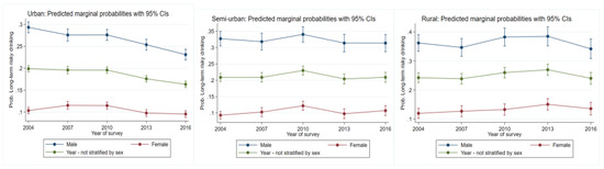 In all areas, males were at a greater risk overall than females. For males, in urban areas there was a consistent reduction in the likelihood to engage in long-term risky drinking (p = 0.000, Figure 2, Table 2). For females, risk increased up to 2010 (p = 0.04) and declined thereafter. Semi-urban areas females had significant increases in risk up to 2010 (p = 0.002), followed by a decline in 2013 and a slight increase thereafter. Risk for both males and females residing in rural areas were similar over time. Despite oscillating risk for males between 2004 and 2016, these proved to be non-significant.