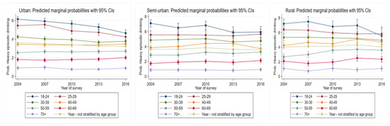 For those living in urban areas, over time, the 18–24-, 25–29, and 30–39-year-old groups (p = 0.000, Figure 3, Table 1) all had consistent reductions in risk of heavy episodic drinking. In contrast, the 60–69-year age group consistently demonstrated increases in risk over time (p = 0.03).