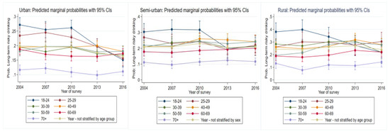 In urban areas, there was a consistent reduction in the likelihood to engage in long-term risky drinking over time (p = 0.000, Figure 2). For semi-urban areas, there was a significant increase in risk up to 2010 (p = 0.003) and then returned to 2004 levels. In rural areas, an increased risk up to 2013 occurred, with a reduction to 2004 levels (p = 0.01).