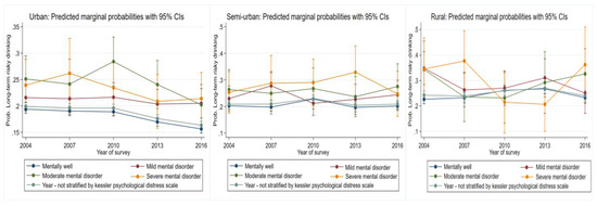 There was a consistent reduction in risk of long-term risky drinking for those who were mentally well residing in urban areas (p = 0.000, Figure 6, Table 2). Risk for those likely to have a moderate, mild, and severe mental illness was oscillating over time. However, these were non-significant. For semi-urban areas, risk for those who were mentally well were significant up to 2010 (p = 0.01) but declined thereafter. Despite oscillating risk for those who were likely to have a mild, moderately, and severely mentally ill, these remained non-significant. For those residing in rural areas, risk of long-term risky drinking significantly increased for those who were mentally well (p = 0.003), but by 2016, these increases had leveled out. Despite oscillating risk for those likely to have a mild and moderate mental disorder, these were non-significant. The risk for those likely to have a severe mental disorder declined between 2007 and 2013.