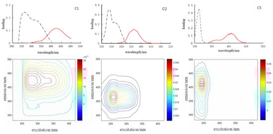 | Component 1 Humic acid-like | 265/334; 275/425; 315/425 | Terrestrial humic-like material Marine humic matter | C3: 310/380 [28]; C2: 265/475, C4: 275(355)/450 [34,35]; C3: <250/434 [18]; C1: 322/407 [36]; M: 310–320/380–420 [30] |
