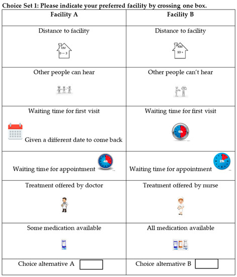 In total, 24 binary choice sets were developed and divided into two versions, namely, questionnaire 1 with 12 choice sets and questionnaire 2 with the remaining 12. Participants were required to choose the alternative they preferred: facility A or facility B. Thus, each patient received 12 choice sets. Visual representations were used to facilitate patient understanding. The questionnaire was initially developed in English and then translated into Afrikaans and Xhosa. Figure 1 shows an example of a choice set.