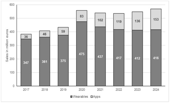 Sales of wearables and fitness apps in Germany from 2017 to 2024. Own representation based on Statista Digital Market Outlook [8].