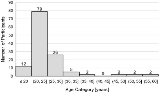 We recruited 130 participants (81 female, 49 male) via WhatsApp groups and Instagram. The sample included young academics and professionals from Germany. They were deliberately selected as potential users of digital sports solutions, most of whom were younger persons (Figure 4), with a mean age of M = 25.7 years (SD = 7.0). Only 12% of the participants did not use any digital sports solutions. The majority used multiple digital sports solutions; for example, 63% integrated social media (like YouTube) into their workouts, and 52% used fitness apps or fitness trackers. However, only 9% of the respondents used fee-based digital sport solutions.