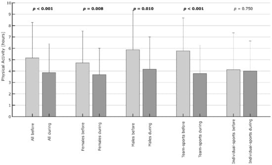 Before the pandemic, the participants (complete population) were active for M = 5.2 h (SD = 3.1 h) per week. During the pandemic, the activity dropped to M = 3.9 h (SD = 2.5 h). We observed a wide spread of values indicating the different fitness levels of the respondents. It is also noticeable that the standard deviation of physical activity before the pandemic is higher than during the pandemic (Figure 5).