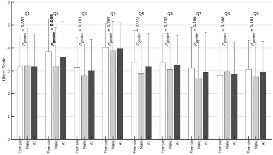 Diagram with means and standard deviations for the respective questions (Q1–Q9). The p-values for the tests of differences between genders are plotted vertically. Bold font indicates a statistically significant (p < 0.05) difference in the response between female and male participants.