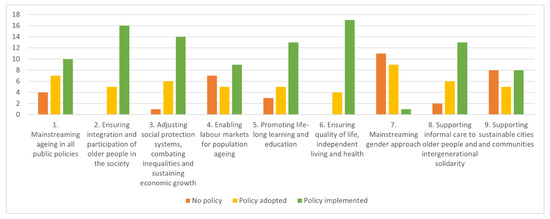 Few national policies address this theme from different perspectives. On the one hand, some policies by the Ministry of Internal Affairs concern the safety of older people, with the implementation of educational campaigns by law enforcement bodies about personal protection from criminals, robberies and frauds at home and in public spaces. On the other hand, the Ministry of Health promotes active and healthy ageing by planning the creation of smart communities (exploiting domotic and assisted living technologies) and better urban spaces, as indicated in the Operative Health Plan—National Strategy for Smart Specialisation.
