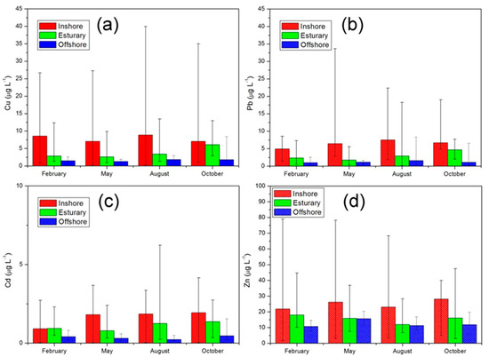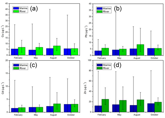 Metal seasonal variations in water samples from Liaodong Bay and rivers flowing into the bay. Error bars indicate standard errors. (a) Cu; (b) Pb; (c) Cd; (d) Zn.